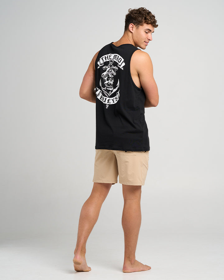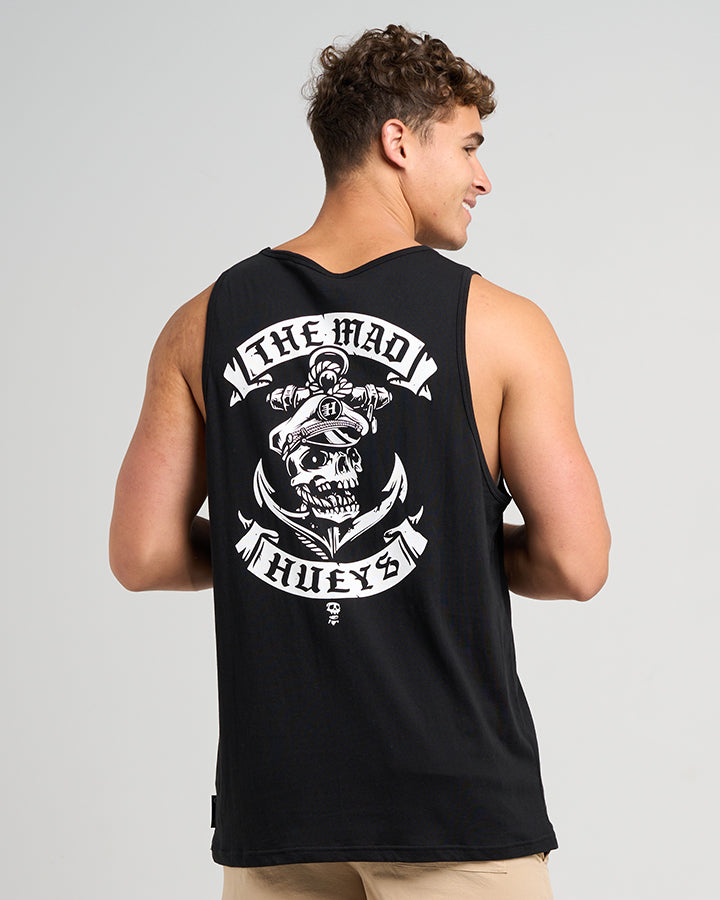 The Sailor Anchor Tank in Black by The Mad Hueys is a must-have for salty sea dogs and sun-soaked legends. Featuring a bold skull and anchor graphic with a sleeveless cut, the Sailor Anchor tank is perfect for boat days, barbecues, and raising hell under the summer sun. All hands on deck β€” this one’s a ripper.
