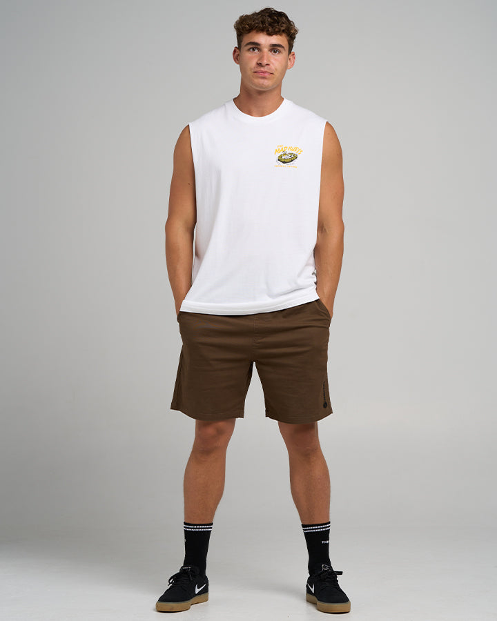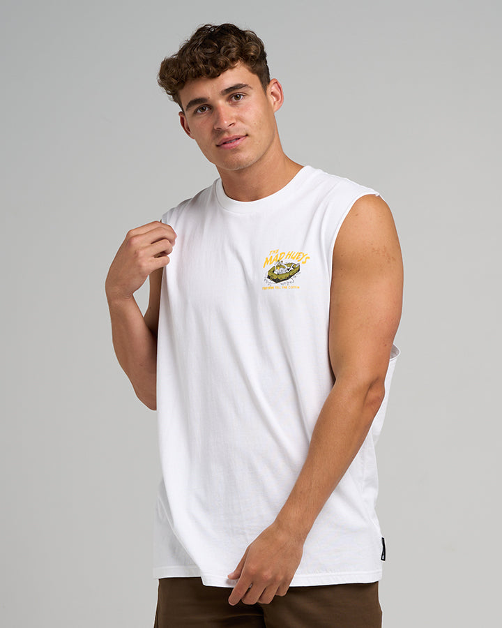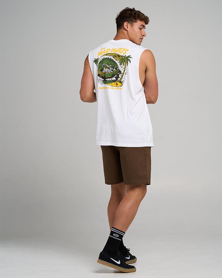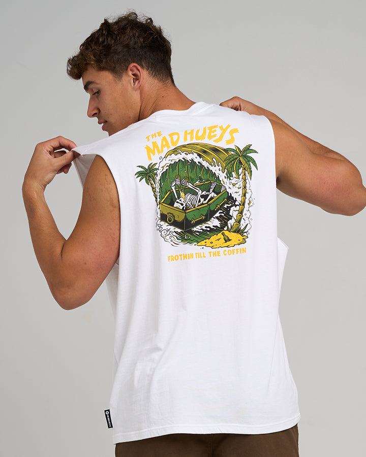 The Frothin Coffin Muscle in White by The Mad Hueys is for the legends who’ll be chasing waves and good times right up till the end. With its bold coffin surf graphic and sleeveless cut, the Frothin Coffin Muscle keeps you cool while you’re sinking tins, hitting the beach, or raising hell with the crew. Frothin’ till the coffin — that’s the Hueys way of life.