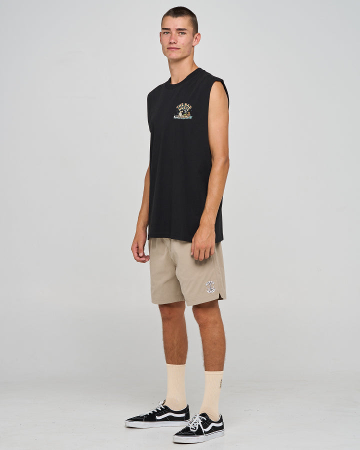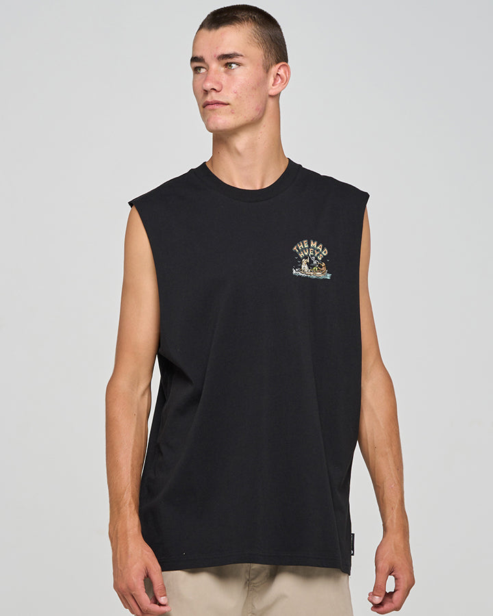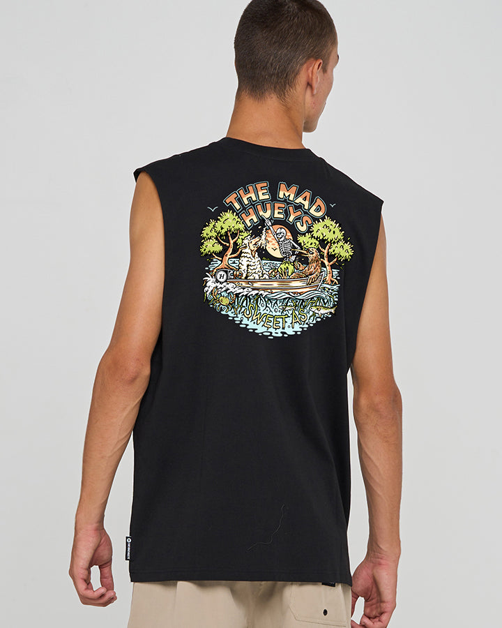 Keep it sweet as with The Mad Hueys SWEET AS NZ Muscle in Black. Featuring a bold New Zealand-inspired print on the back, this sleeveless tee brings laid-back island vibes to your everyday look. Crafted from premium cotton for all-day comfort, it’s perfect for beach missions, boat days, or backyard sessions with the crew.