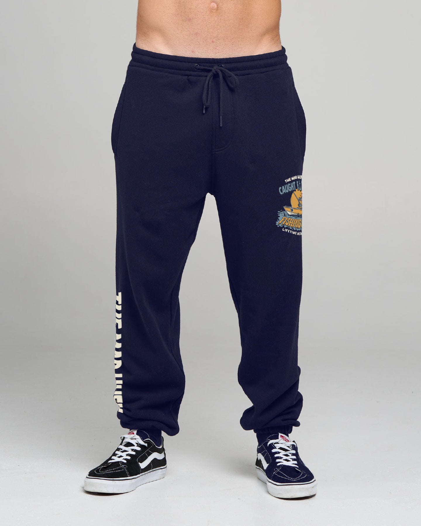 Show off your no-nonsense attitude with the CAUGHT FK ALL JAW | TRACKPANT in Navy. Featuring the same bold text and cheeky Hueys vibe as the tee, these trackpants are perfect for kicking back after a long day on the water or just making a statement wherever you go.