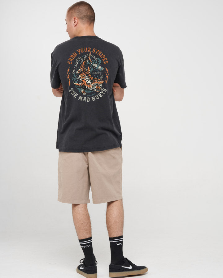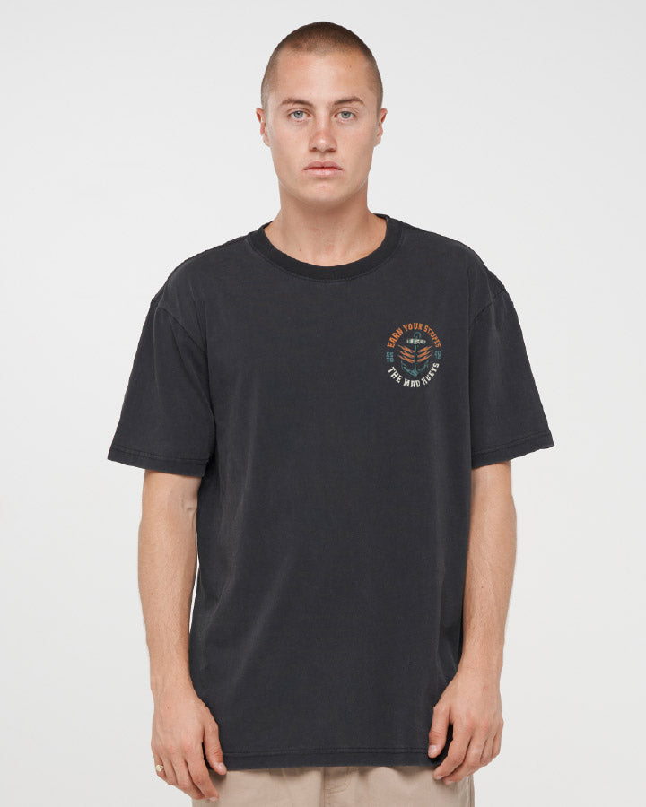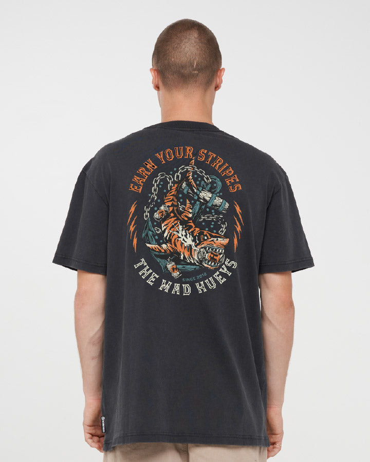 The EARN STRIPES | SS TEE in Washed Black ain’t for the rookies—it’s for the blokes who’ve battled the big ones and come back with a story (and maybe a few scars). Featuring a fierce tiger shark and the slogan “Earn Your Stripes,” this washed black tee is a nod to every hard-earned win out on the water. Whether you’re chasing monsters offshore or just cracking tins with the crew, this one’s all bite, no fluff. Wear it loud, wear it proud—respect is earned, not given.