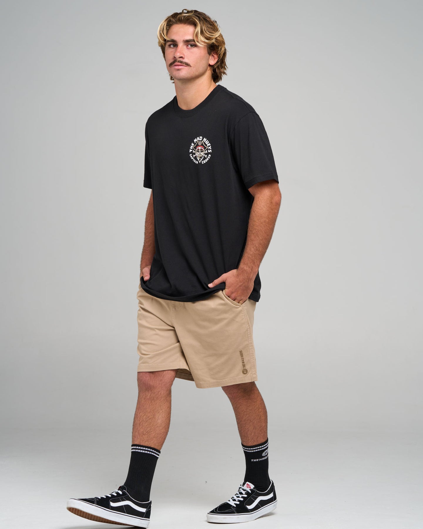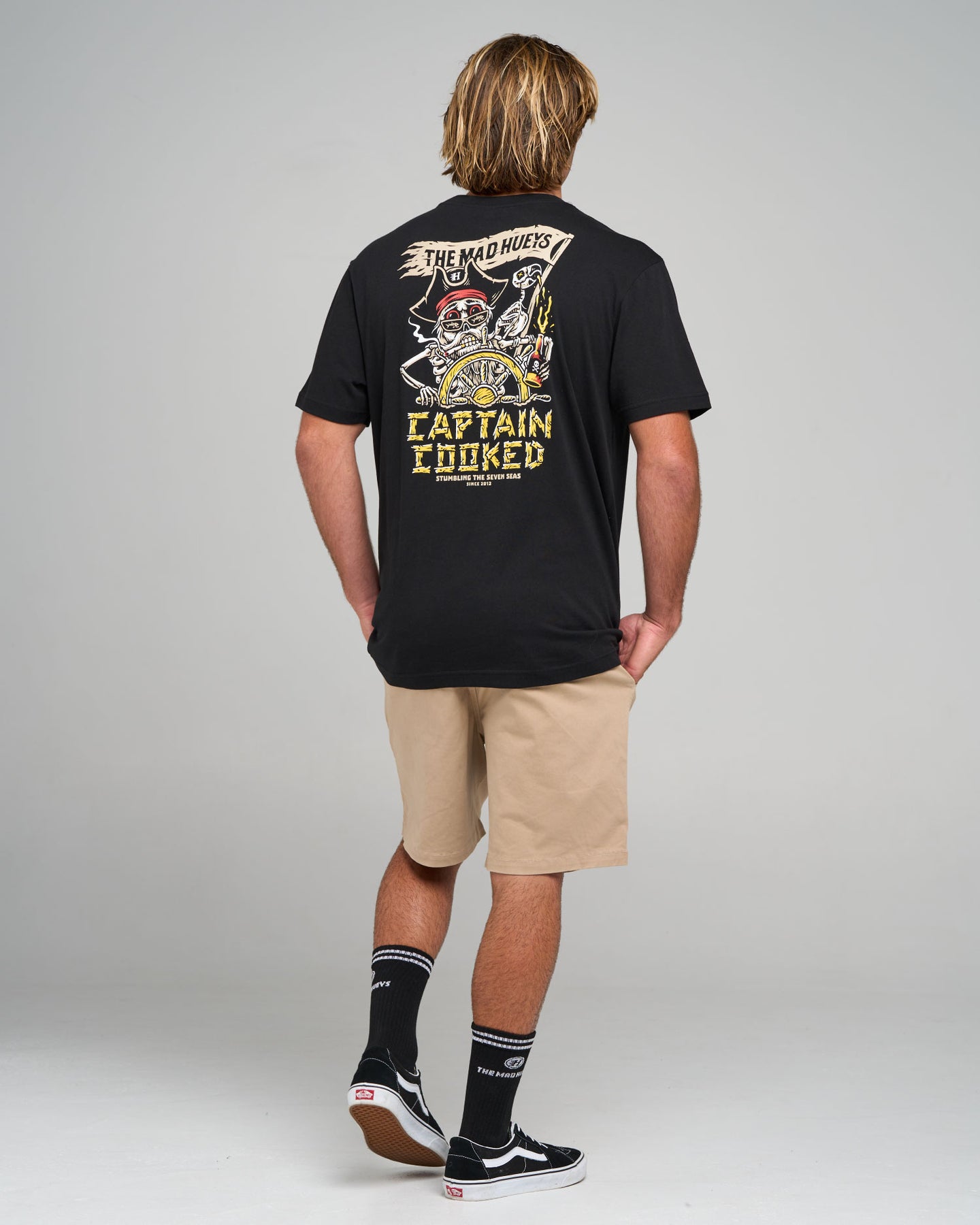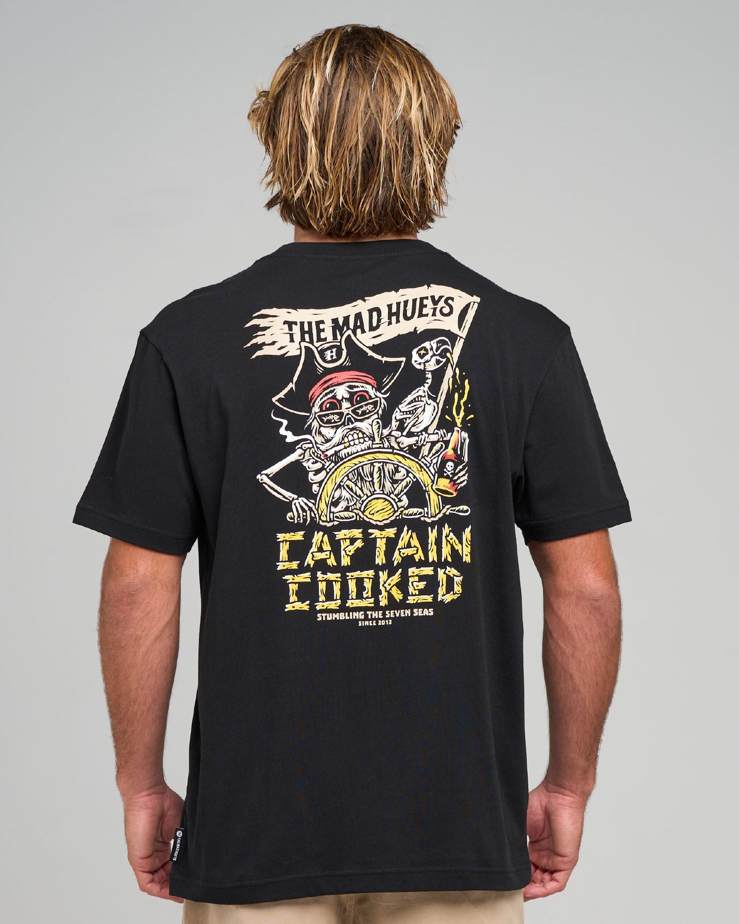 The STUMBLING CAPTAIN COOKED | SS TEE in White is for the legends who’ve seen the edge of the map—and kept stumbling. With a puffed-up skeleton pirate and his equally toasted parrot sidekick, this tee captures the spirit of every cooked unit who's ever gone too hard on a fishing trip and somehow made it back with a story. Rocking the line “Stumbling the Seven Seas,” this black beauty is built for late nights, early tides, and not remembering either. A certified classic for the Hueys Crew who live for the surf, fish, and party chaos.