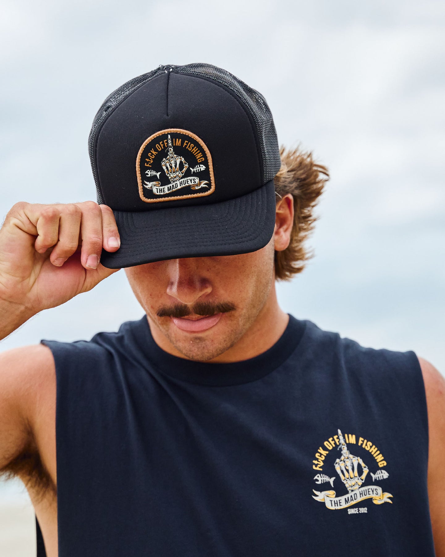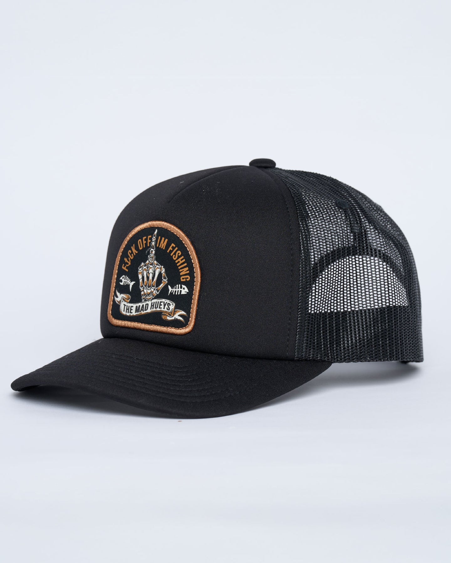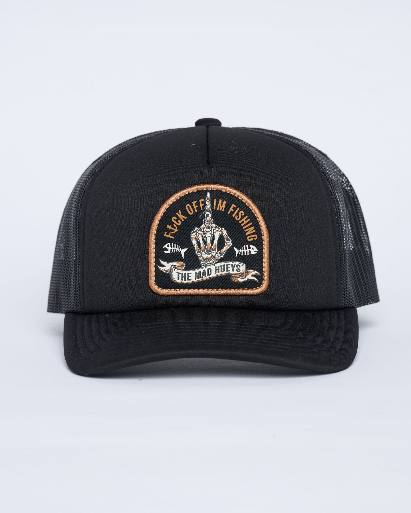 Keep the message clear and the vibe strong with the FK OFF FISH | FOAM TRUCKER in Black. Featuring the same bold “Fk Off, I’m Fishing” slogan, rude finger, fish skeletons, and hibiscus flowers as the tee, this black foam trucker is perfect for those who want to keep distractions off the water and good times rolling. Rugged, comfortable, and full of Hueys attitude—just how we like it.