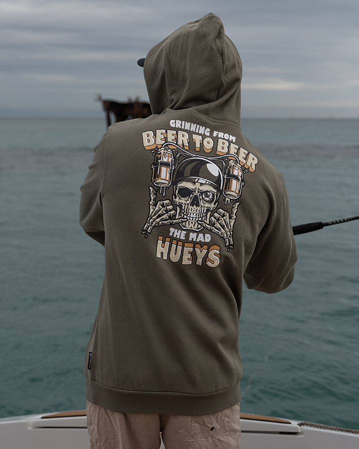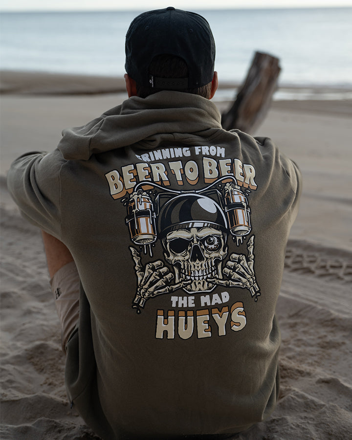 The men’s Beer to Beer Hoodie in Olive is for the life of the party—the bloke who’s always got a laugh, a beer in hand, and a wild story to tell. The back features a skeleton head rocking a helmet with beers attached, because why settle for one when you can have two? This hoodie screams party vibes and is perfect for the guy who’s all about having a good time, sinking a few cold ones, and keeping the energy high. Throw it on and get ready to be the legend of the night!