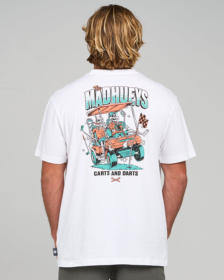 The CARTS AND DARTS | SS TEE in White is pure chaos on wheels. Featuring a mad crew of drinking skeletons tearing across the golf course in a golf cart, this tee is for the blokes who’d rather party than putt. Speeding, smashing tins, and living that no-rules Hueys life, this white tee brings all the fun of the course without the boring bits. Perfect for those who like their golf with a side of madness.