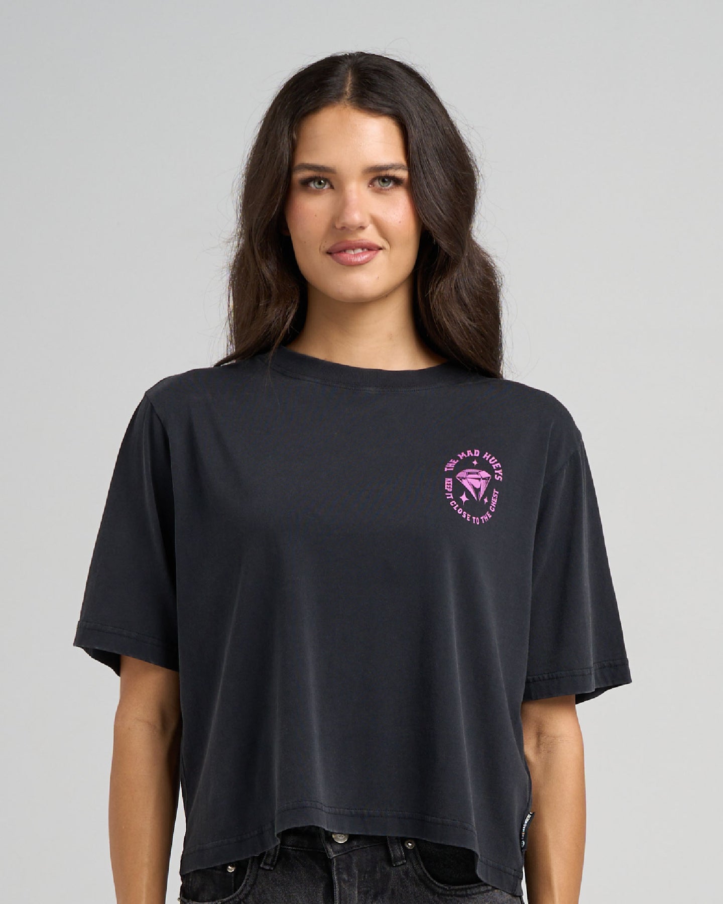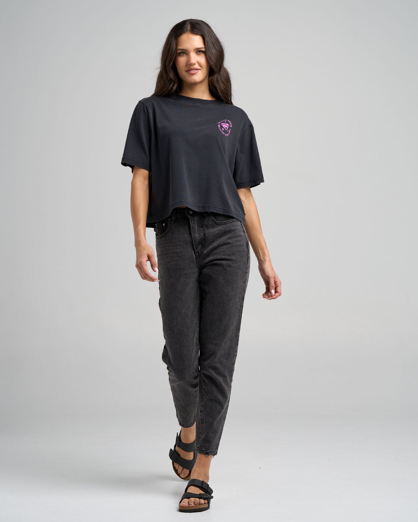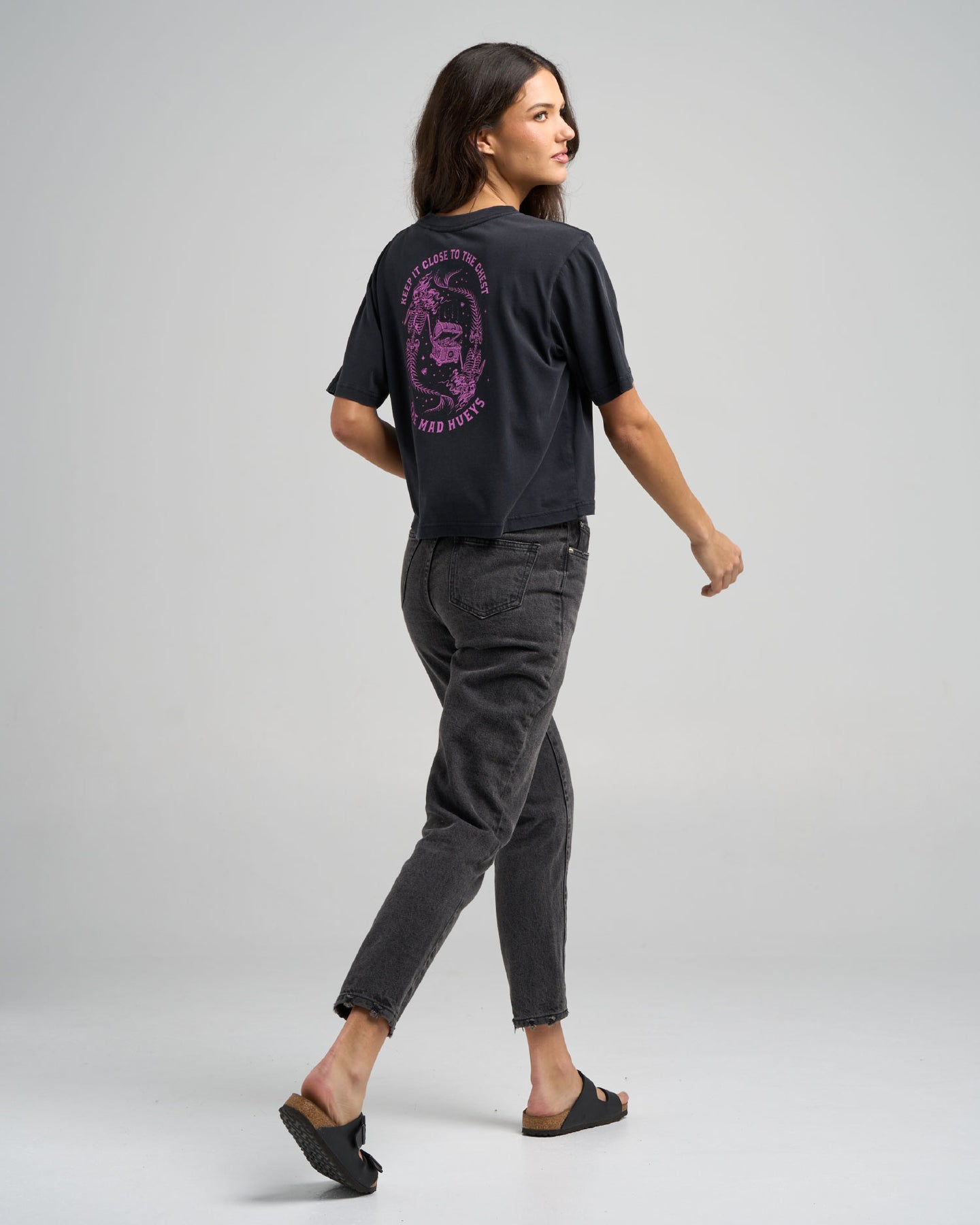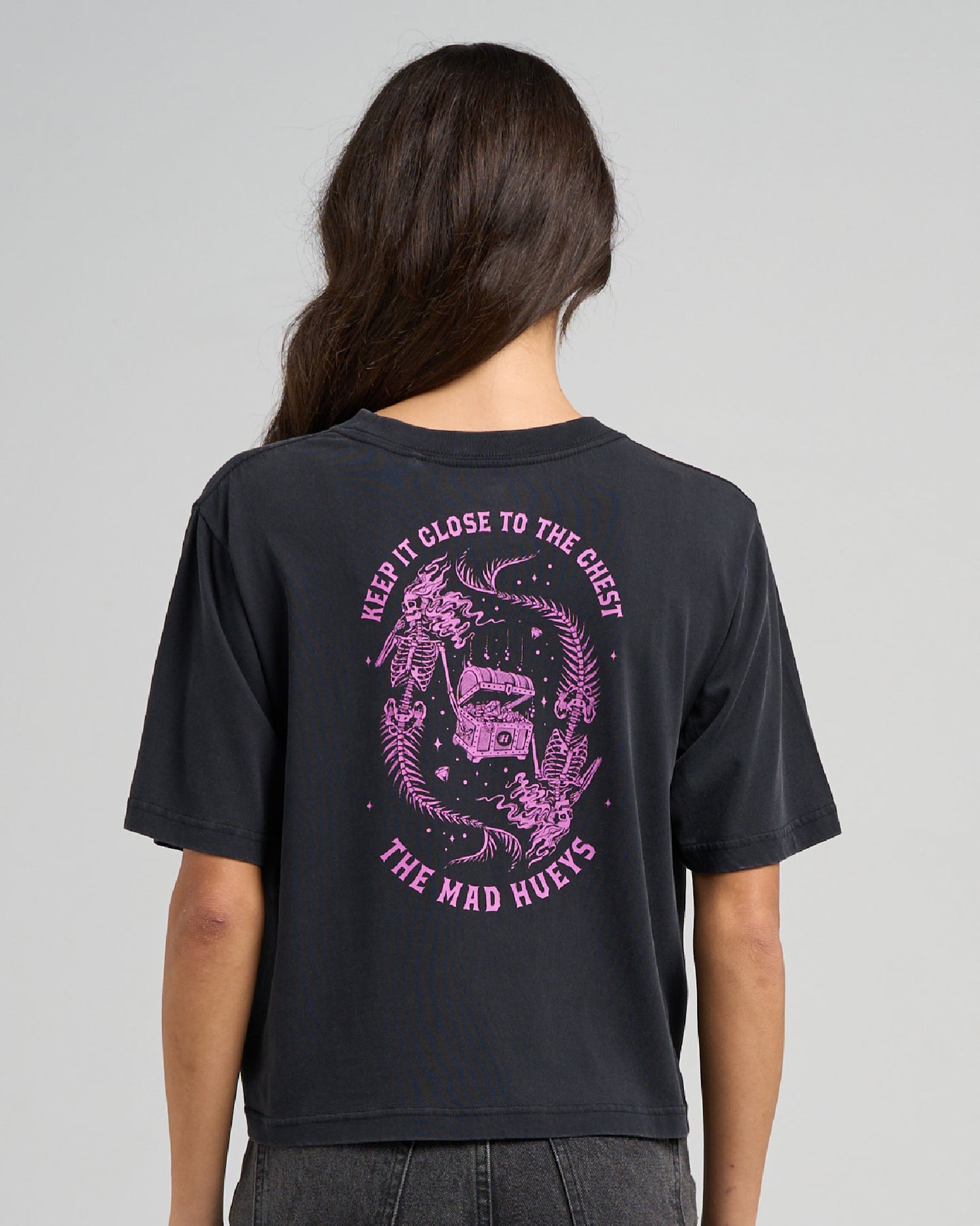 Keep your secrets safe with the CLOSE CHEST | WOMENS BOXY TEE in Washed Black. Featuring skeleton mermaids guarding a treasure chest in a vibrant purple print, this tee brings a mix of mystery and attitude perfect for the bold Hueys lady who likes to keep it close to the chest.