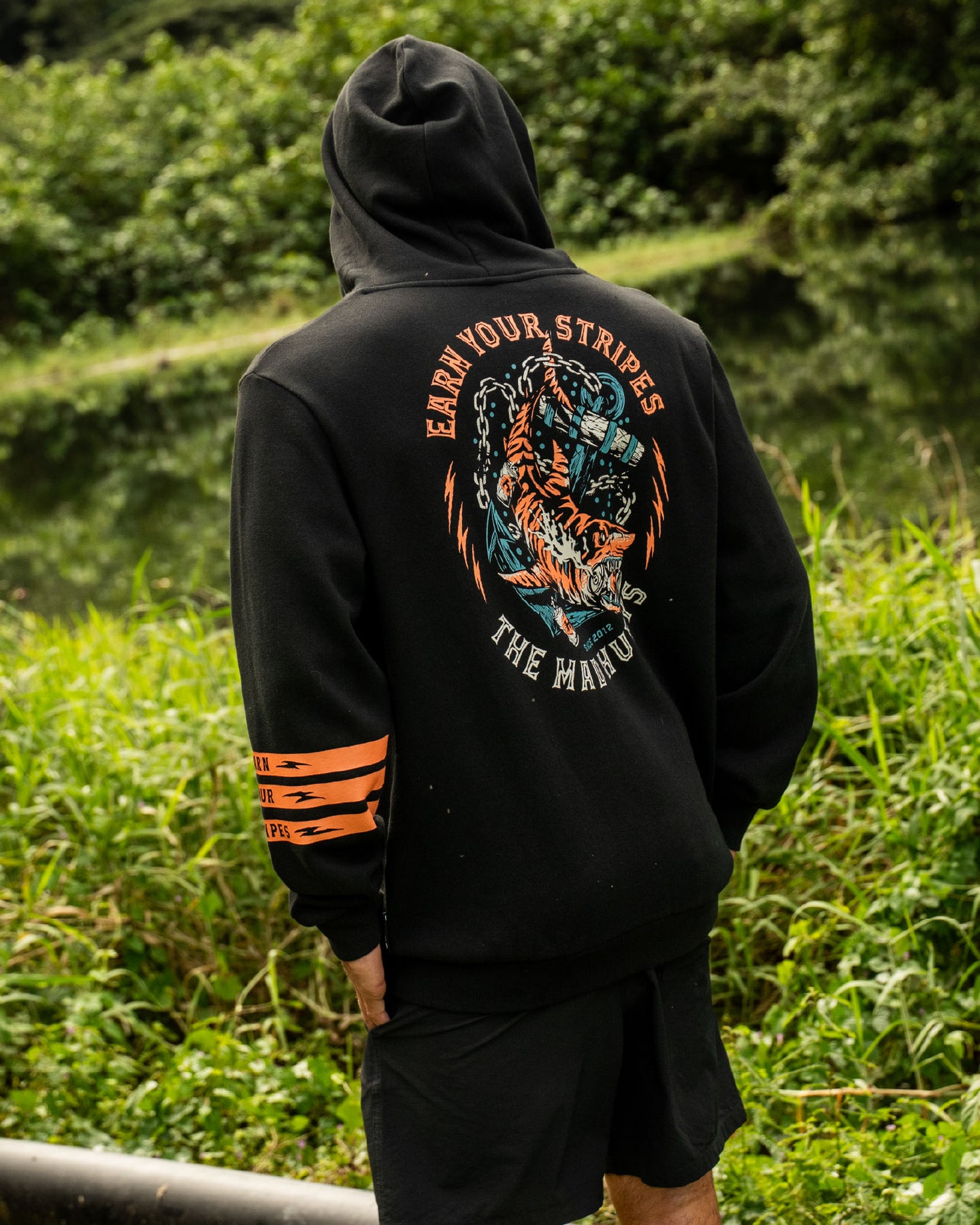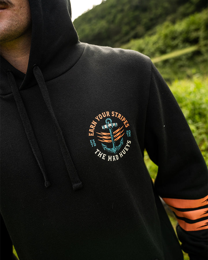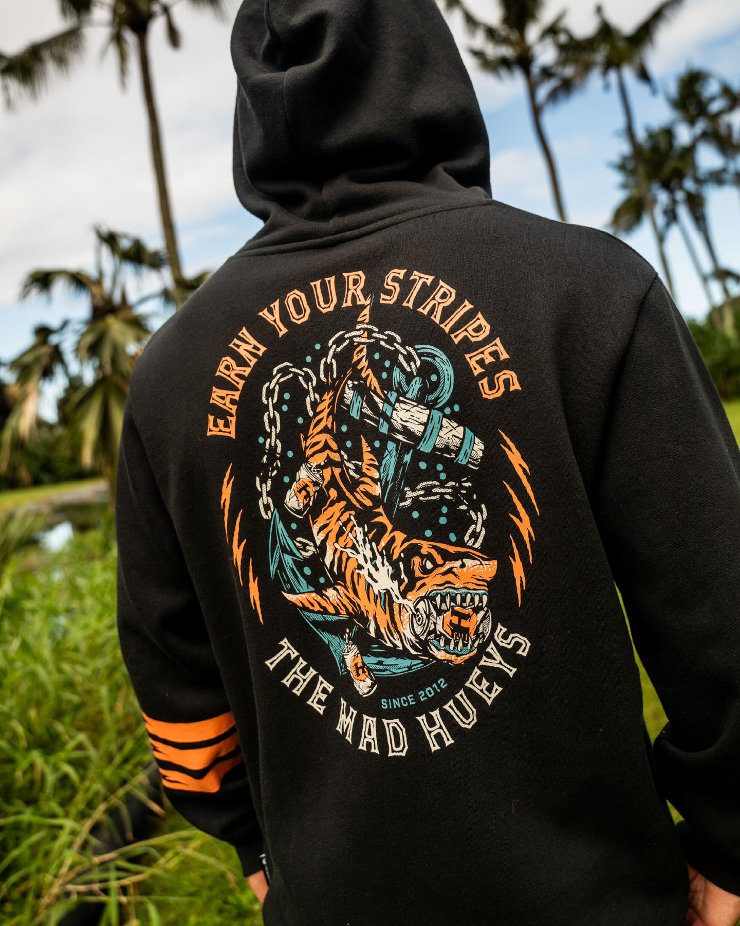 Wear your stripes with pride in the EARN STRIPES | HOODED PULLOVER in Black. Featuring the fierce tiger shark and the bold “Earn Your Stripes” slogan, this hoodie is built for those who hustle hard on the water and in life. Tough, comfortable, and dripping with true Hueys grit.