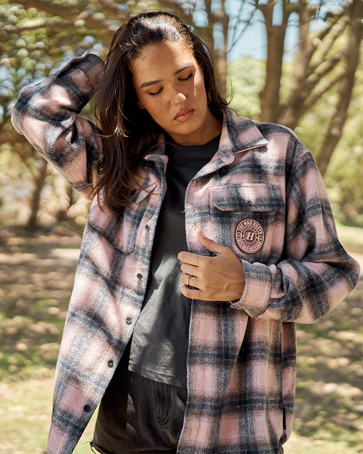 The Mad Hueys’ Hueys Good Life Women’s Shacket in Dusty Pink blends the laid-back vibe of a shirt with the cozy warmth of a jacket. Crafted from soft, brushed flannel in a dusty pink and beige plaid, it features dual chest pockets (one adorned with a subtle Hueys Good Life patch), full snap-button closure, and side pockets for extra comfort. Perfect for layering over your favourite tee or hoodie, this relaxed-fit shacket is made for sunrise surf checks, weekend adventures, or chilly evenings by the coast.
